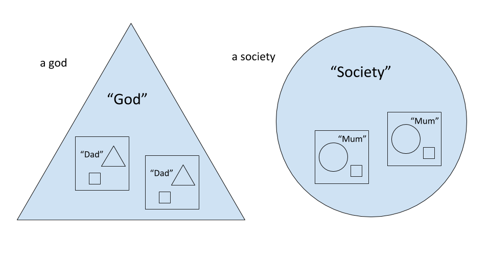 Figure 2. Individuals are socialised into seeing only one god or society. Religious or secular societies consist of individuals who share a social reality, as represented by the coloured space within the big triangle or circle. This intersubjective ‘reality’ contrasts with objective reality, in which individuals can see the various religions and societies in the same way as they can see that there are many parents, not only ‘Dad’ and ‘Mum’.