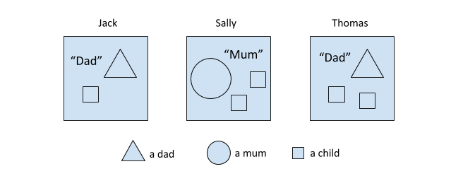 Figure 1. The big squares represent three friends in the objective space of a street, for instance. Each of them is a biological individual identified by personal name. Everyone can see the other two adults being called Mum or Dad in the intersubjective space of their families. The inside of each square represents such a normative context, in which the children, as represented by small squares, are supposed to see only one dad or mum. In addressing the children, each adult refers to the other as Mum or Dad as if they were referring to their own mother or father. This alludes to a common father or mother, which turns their objectivity into intersubjectivity (see Fig. 2).
